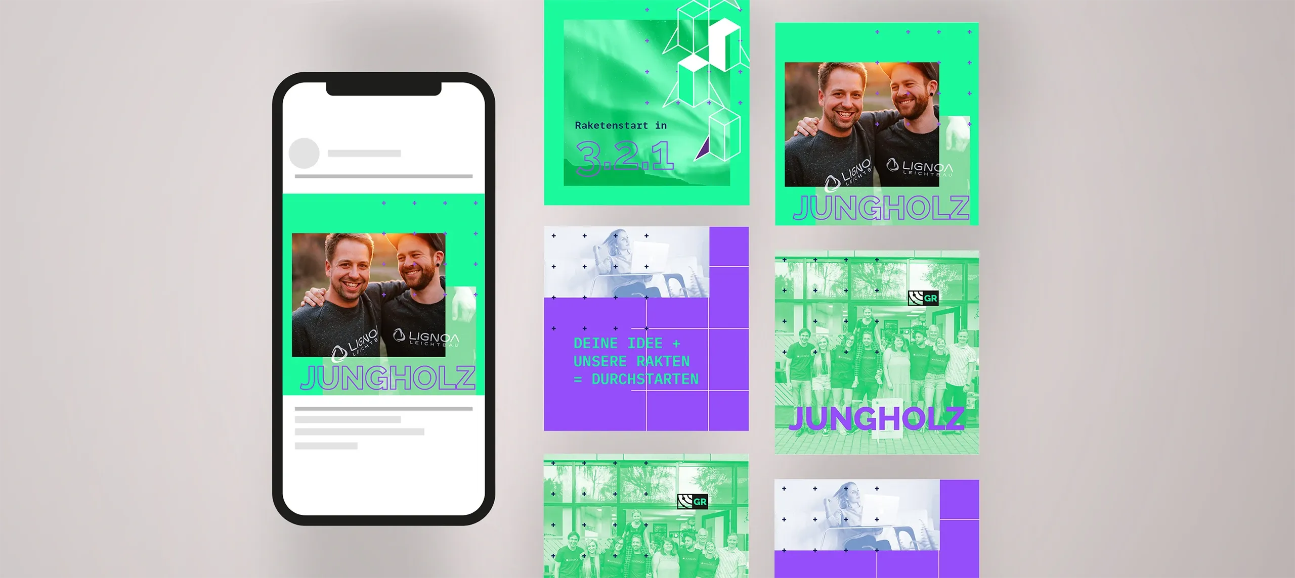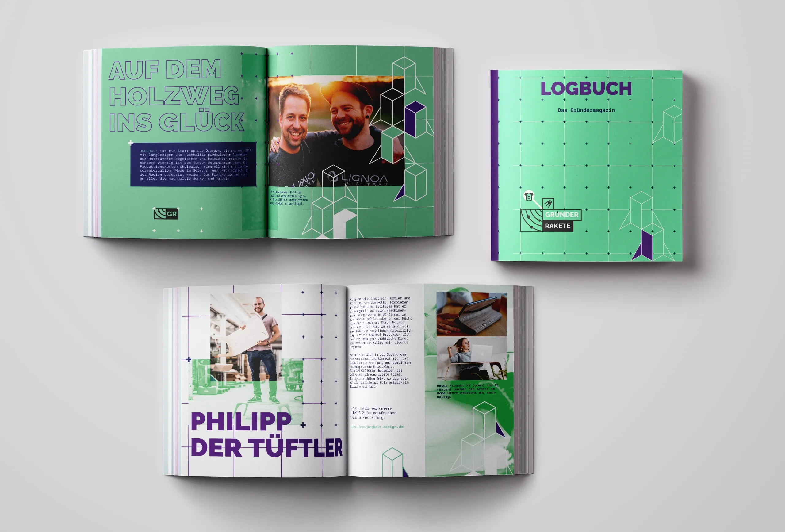 Bei der Gestaltung der Bildwelt für die Gründer Rakete berücksichtigten wir das Gedankenspiel den Gründer auf seine „Weltraumreise“ zu neuen Unbekannten zu begleiten. Dieses Thema war für uns Gestalter natürlich eine Fundgrube für kreative Ideen. So nutzten wir altes NASA Material als Quelle für Gestaltungselemente. Das Raster welches auf Website und Printmaterialien vorkommt, soll an das Kartografieren von Mond- und Planentoberflächen erinnern.