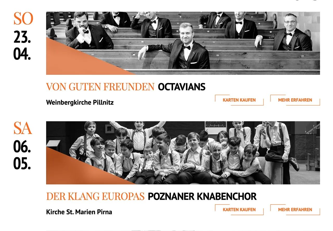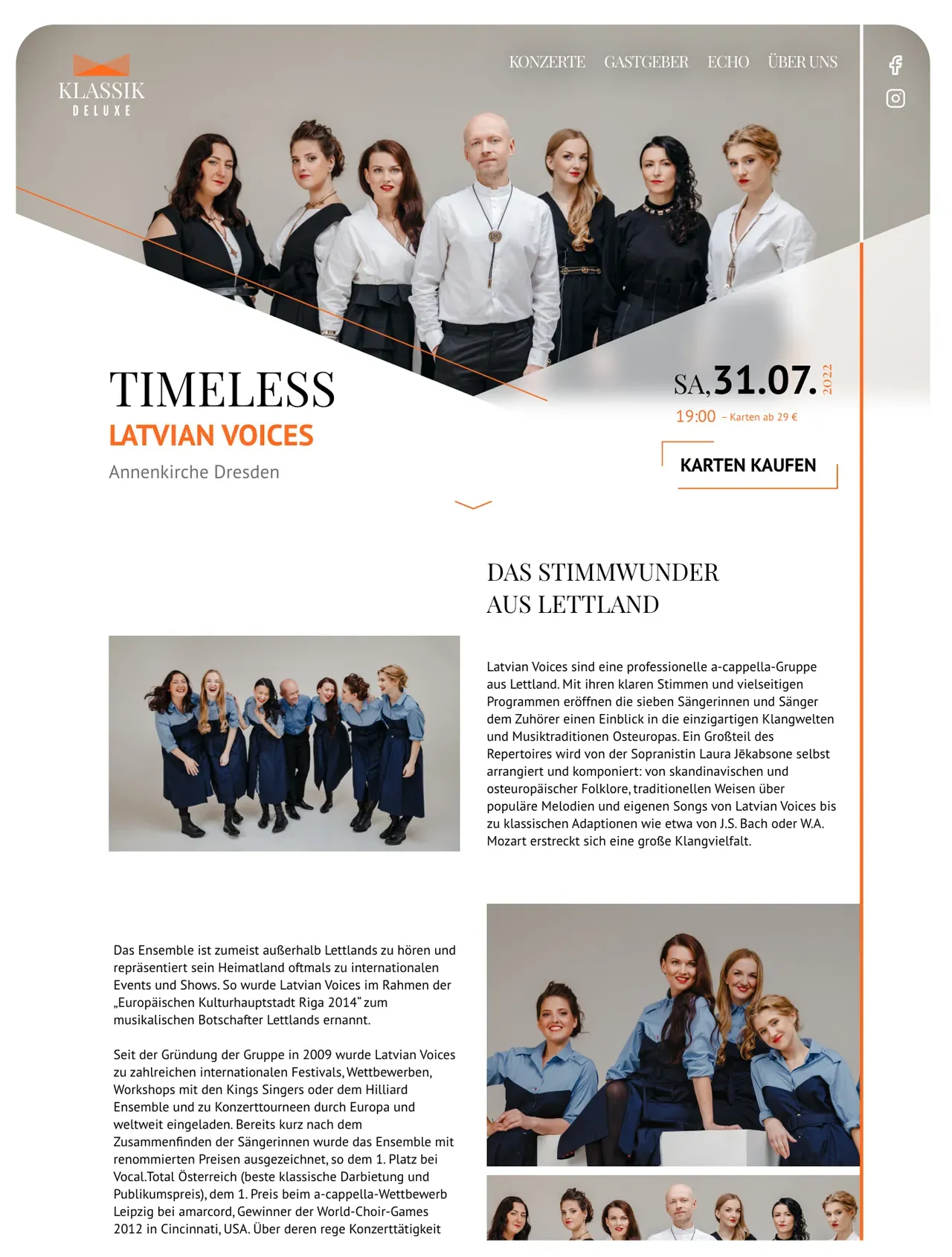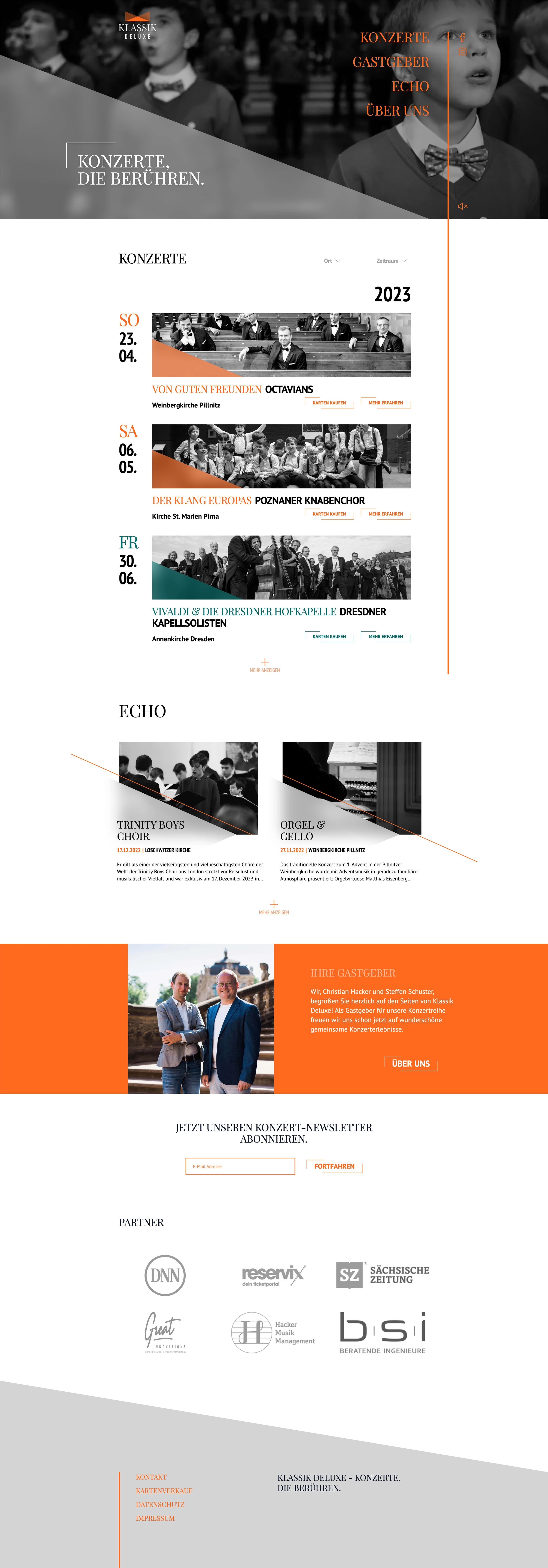 Als ehemalige Mitglieder des Dresdner Kreuzchores haben Christian und Steffen die klassische Musik schon früh lieben gelernt — besonders die Chormusik. Für ihr neues Veranstaltungsformat Klassik Deluxe suchten sie eine kompakte All-in-One-Lösung im Web: Bewerbung künftiger Konzerte, Anbindung an den Kartenvorverkauf, Präsentation bisheriger Highlights — all das sollte die künftige Website leisten können. Und natürlich sollte die Passion der beiden Gründer spürbar werden, einzigartige Momente mit hohem künstlerischem Anspruch zu schaffen.