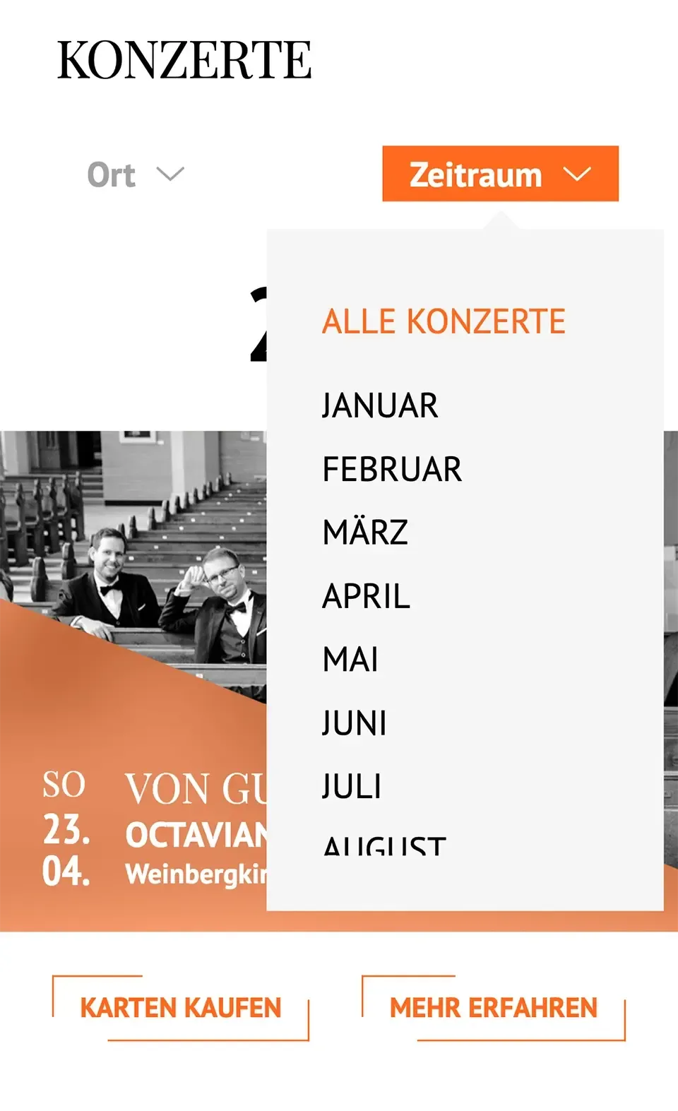 Eine responsive Website — behutsam entwickelt auf Basis des vorhandenen Erscheinungsbilds — setzt aktuelle und vergangene Konzert-Angebote wirkungsvoll in Szene. Hochwertige Konzert- und Portraitfotos wecken Emotionen, transportieren Leidenschaft und rücken das künstlerische Schaffen der Musiker in den Mittelpunkt.