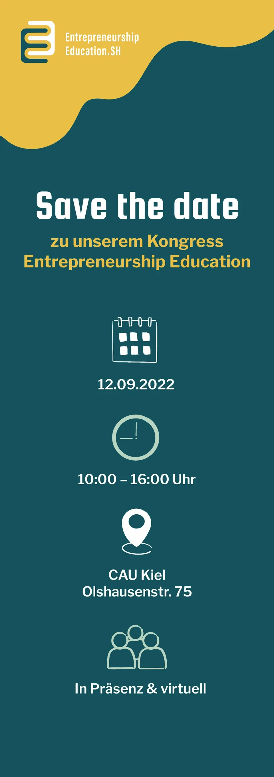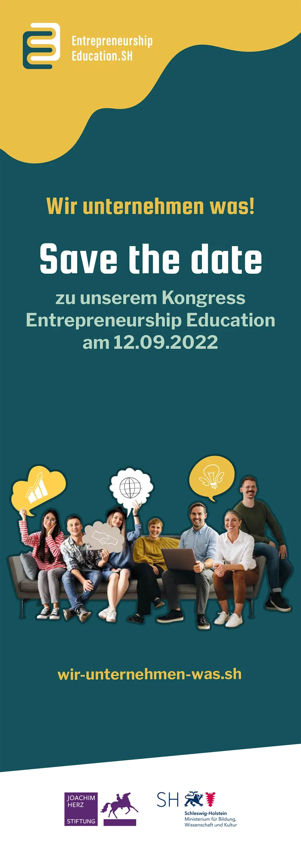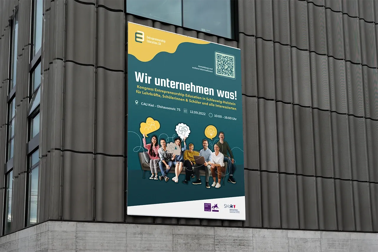 Im Auftrag des Ministeriums für Allgemeine und Berufliche Bildung, Wissenschaft, Forschung und Kultur Schleswig-Holstein entwickelten wir die visuelle Identität für Entrepreneurship Education – ein Veranstaltungsformat zur Förderung von Unternehmergeist bei Jugendlichen. Unter dem Claim „Wir unternehmen was“ entstand ein vielseitiges Event mit Hauptbühne und über zehn Workshopräumen. In Zusammenarbeit mit der e-team GmbH übernahmen wir die grafische Umsetzung sämtlicher Veranstaltungsmedien von den ersten Entwürfen bis zu den fertigen Produkten.