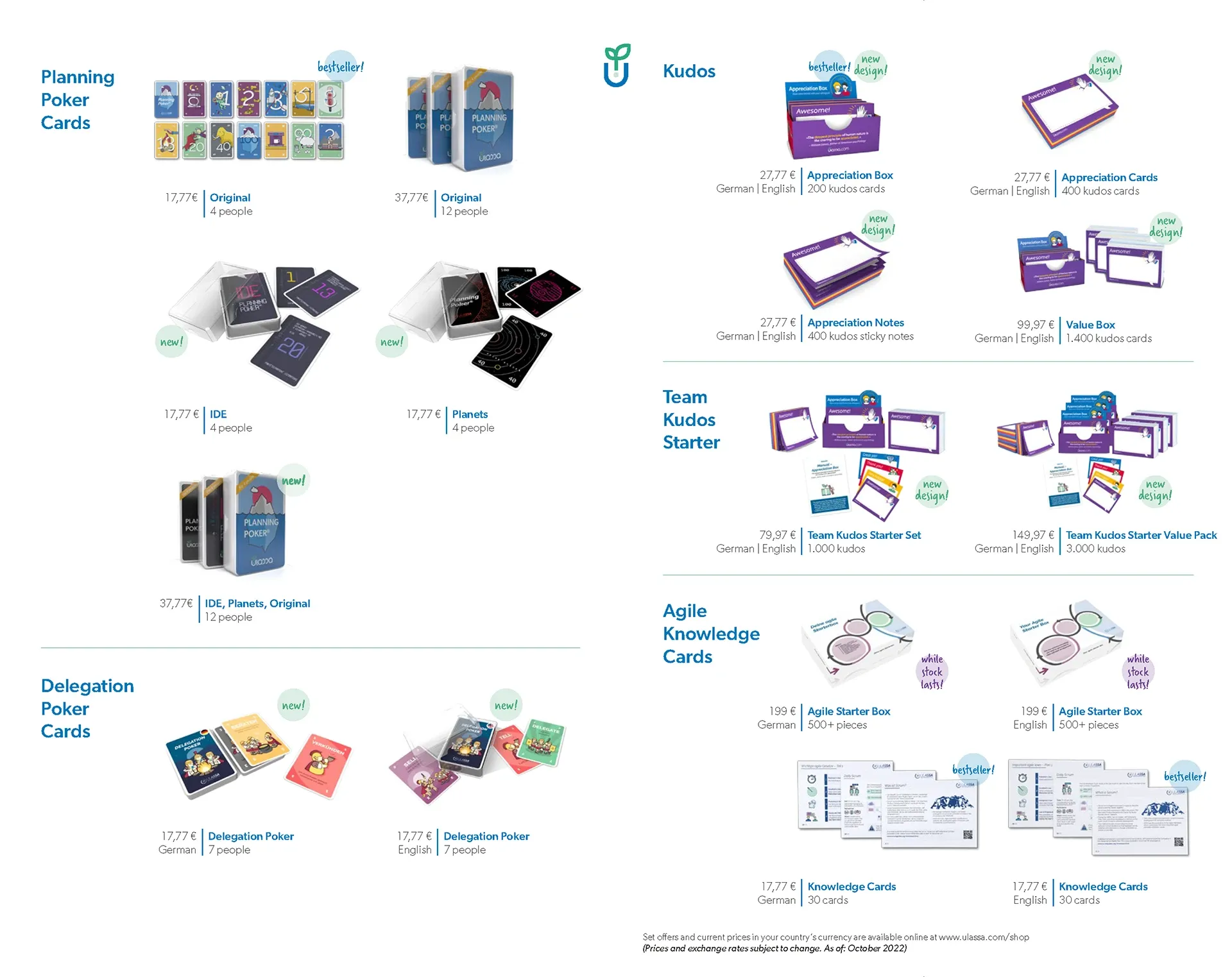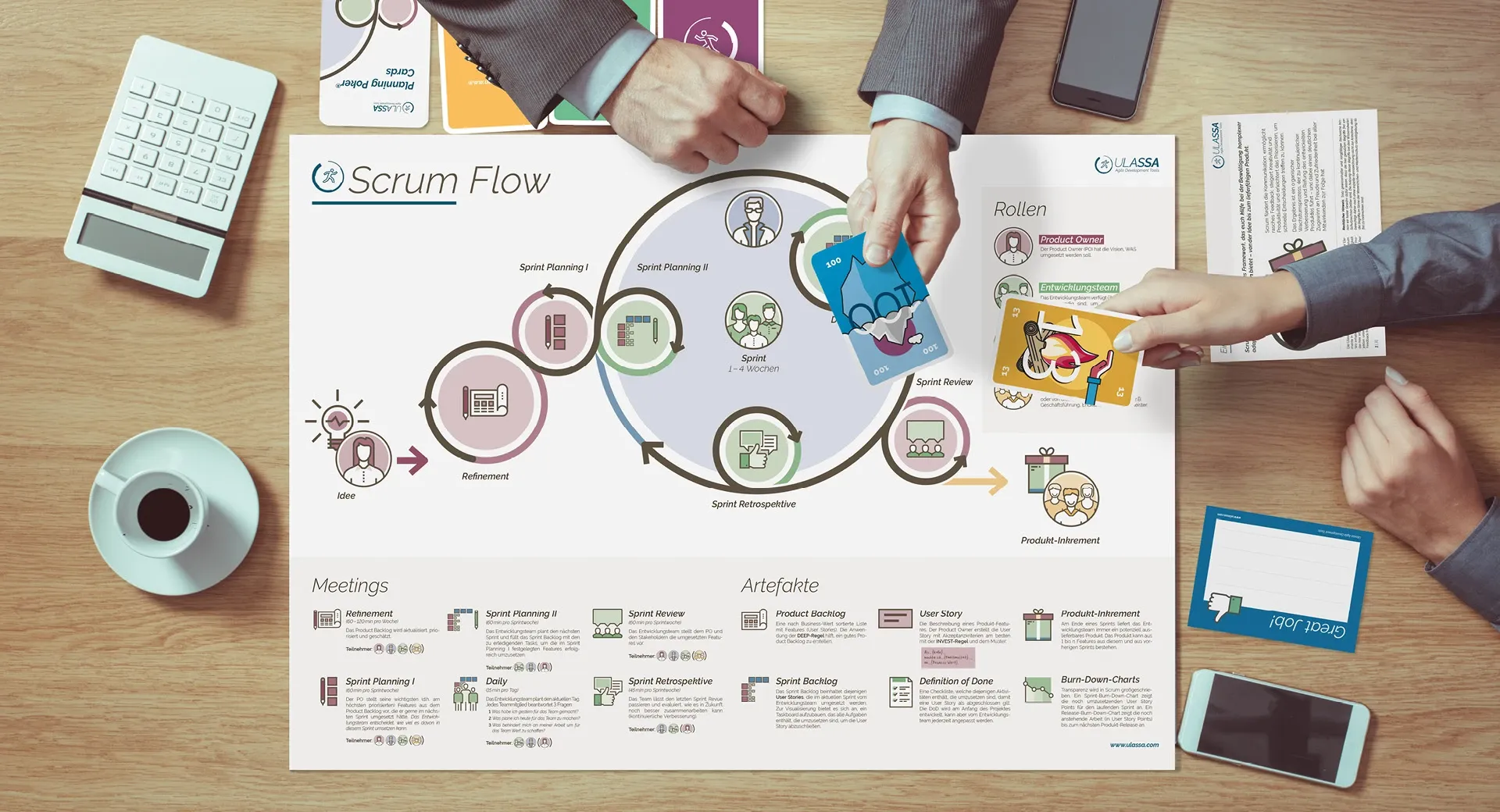 Anfangs dominierten gedeckte Farben – bewusst neutral gewählt, um in Workshops nicht zu dominieren, sondern zu unterstützen. Mit dem Rebranding erhielt Ulassa eine differenziertere Farbpalette: Klarere Akzentfarben ermöglichen nun eine stärkere Strukturierung der Produkte – sichtbar etwa auf den neu gestalteten Planning Poker Karten, wo Farbigkeit Orientierung bietet, ohne die Lesbarkeit zu beeinträchtigen.